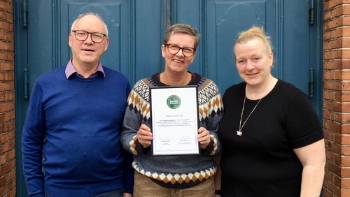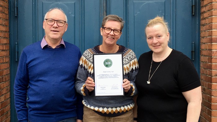 Daglig leder, Lotte Rye Wæde, står med diplomet, som det synlige bevis på anerkendelsen, og hun er omkranset af kirkens faste kirketjenere Kim Nielsen og Pernille Dalskov Bårris, som begge gør en stor indsats for borgere, der er i støttet beskæftigelse i kirken.